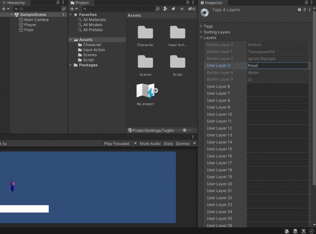 は「床」と判定するレイヤーを指定します。インスペクターで Floor