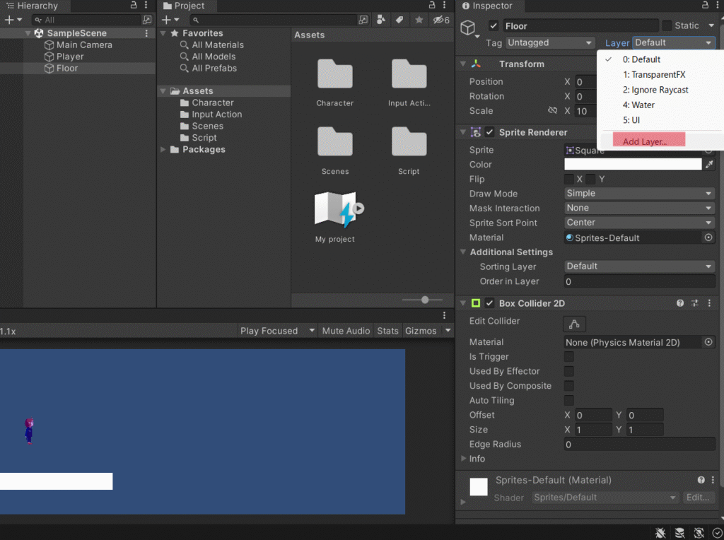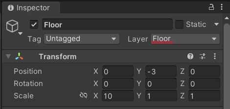 - Inspector の Layer プルダウンから、今作成した Floor を選びます。