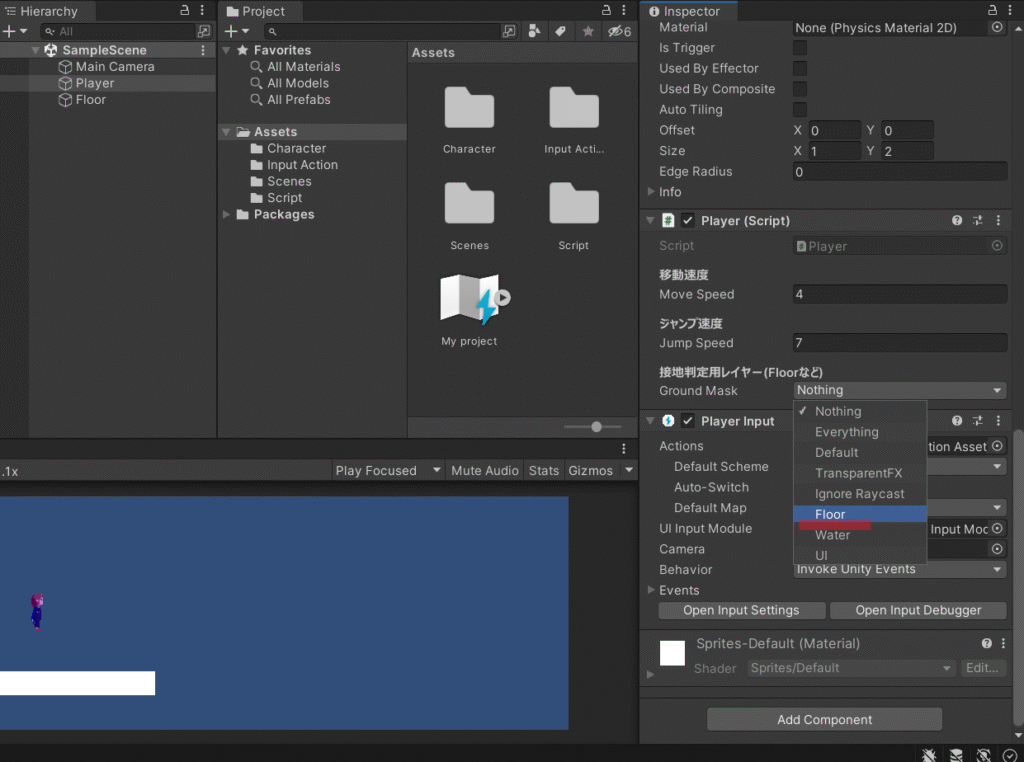 - Playerのインスペクターで Ground Mask = Floor に指定