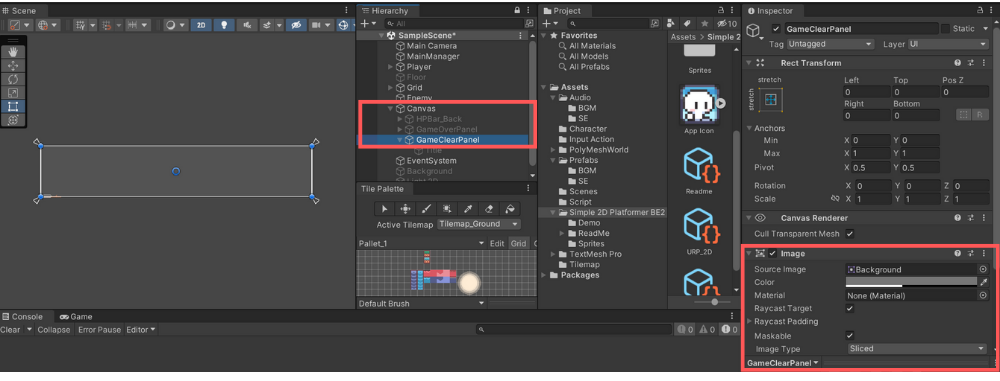 上記を定義したら、Unity上から①で作成したGameClearPanelをドラッグ&ドロップしてください!