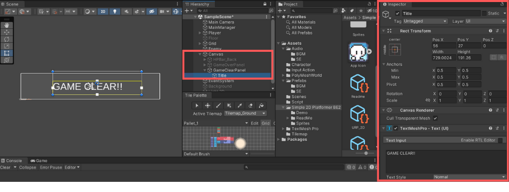 - GameClearPanel の子に UI → Text (TextMeshPro)を追加