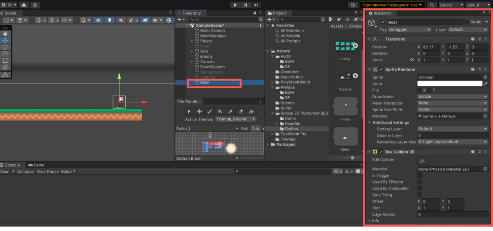 - Hierarchyで「2Dオブジェクト → Sprite → Square」を作成する(名前はGoalにする)
