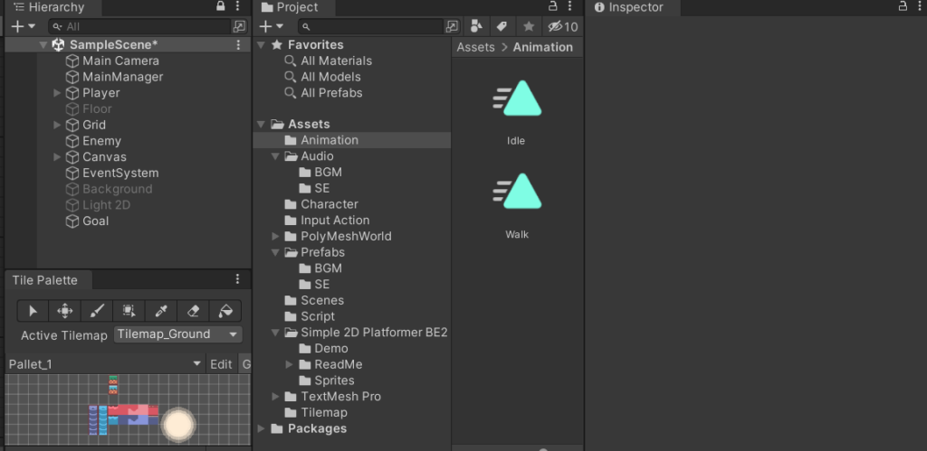 1. ProjectタブのAssertフォルダを選択し、「Animation」フォルダを作成する
