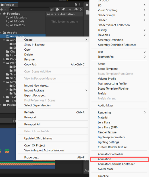 2. 「Animation」フォルダを選択し右クリックでCreate > Animation ボタンを押す