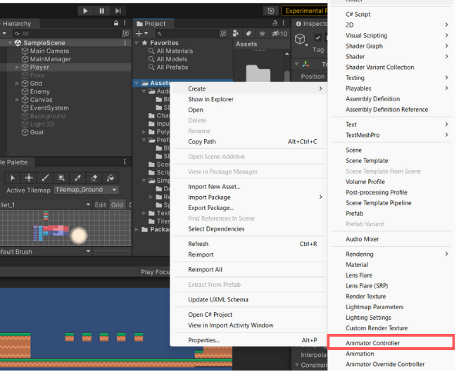 1. 「Animation」フォルダを選択し右クリックでCreate > AnimationController ボタンを押す