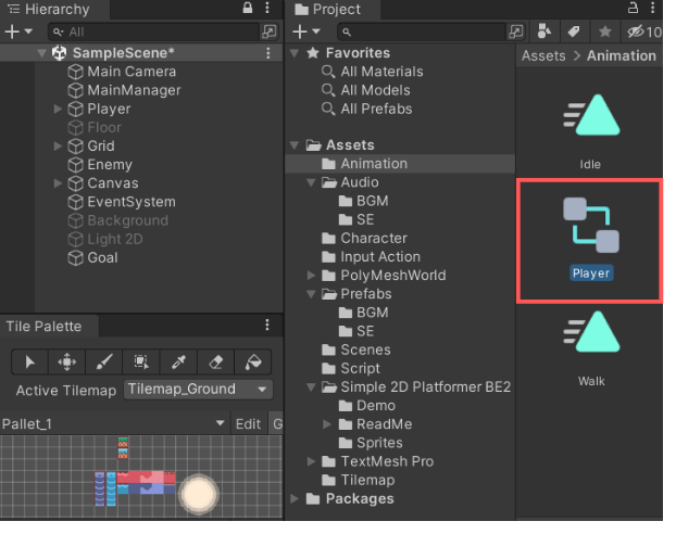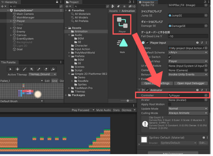 AnimationControllerを作成したら、Playerオブジェクトと紐づけるようにします。