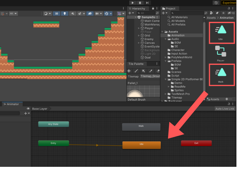 2. Animator ウィンドウに「Walk」、「Idel」をドラッグして配置する