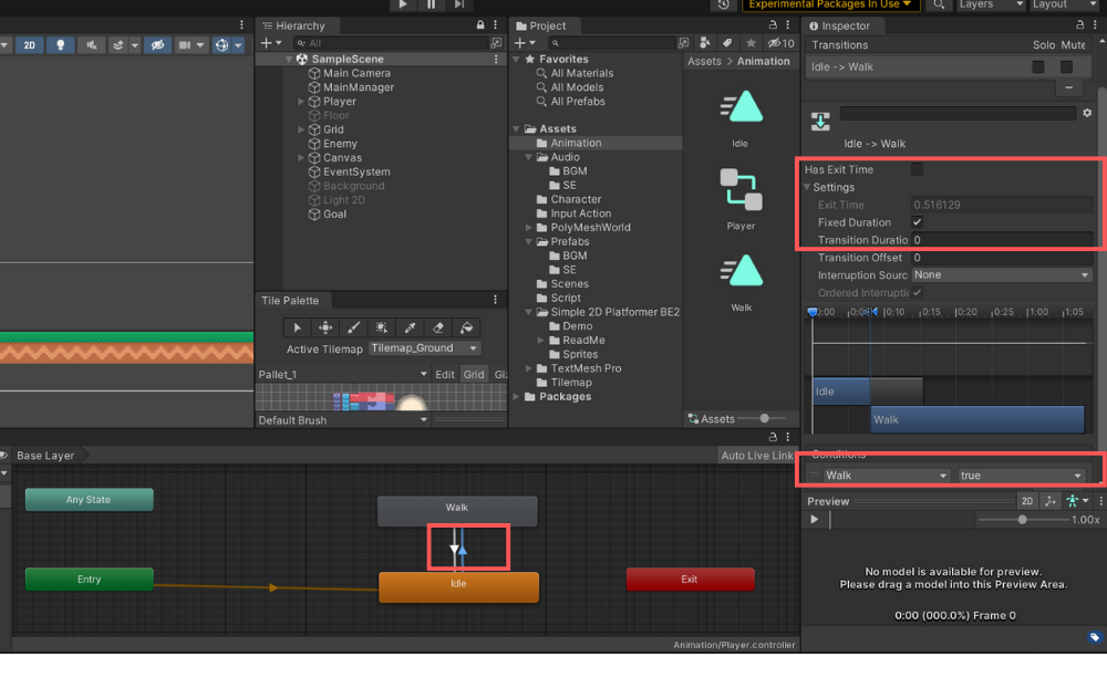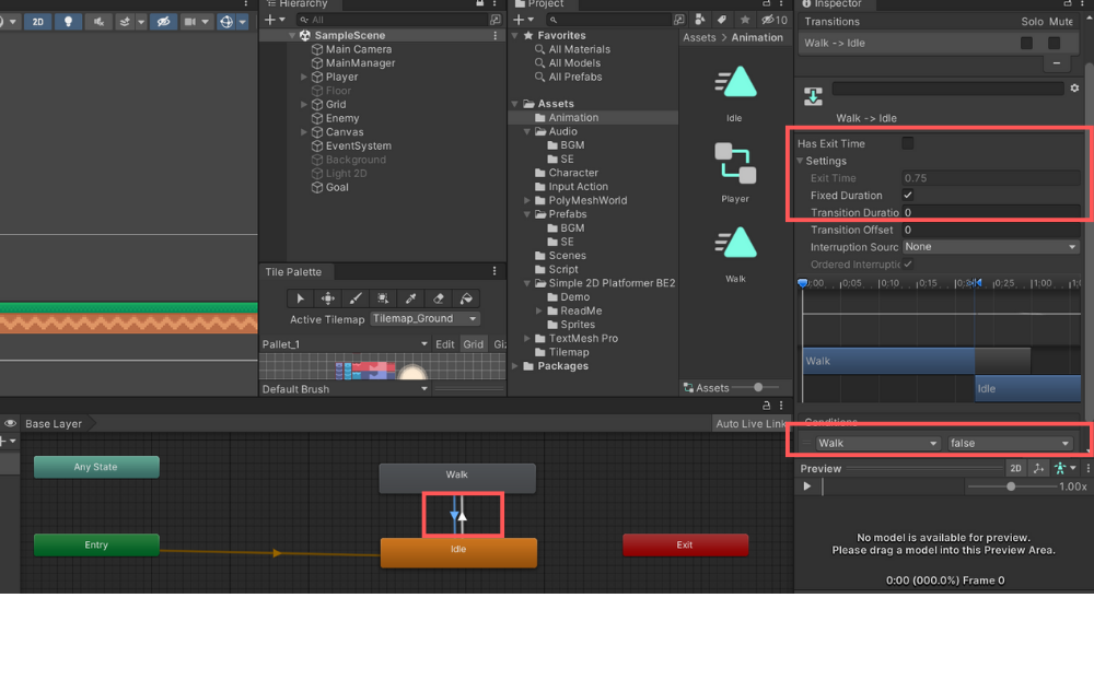 • Animator で 待機(Idle)⇔歩行(Walk) を条件で切り替える設定をする